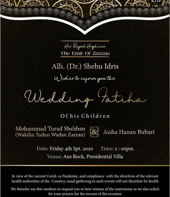 In the invitation, the Emir of Zazzau, Alhaji (Dr) Sheju Idris wishes to inform the general public of the wedding Fatiha.