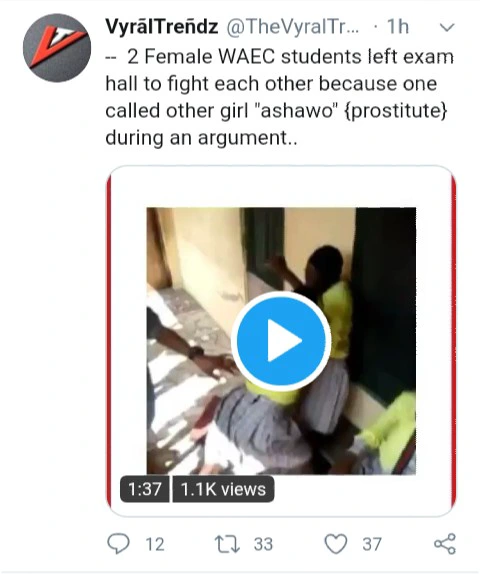 Two female WAEC students started a huge fight among themselves today after one of them reportedly insulted the second because she noticed the way she follow boys all around.
