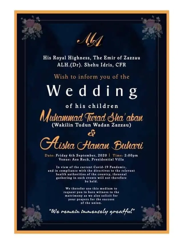 Below is her wedding invitation card and the wedding Fatiha will be held inside the Aso Rock Villa on the 4th of September 2020.