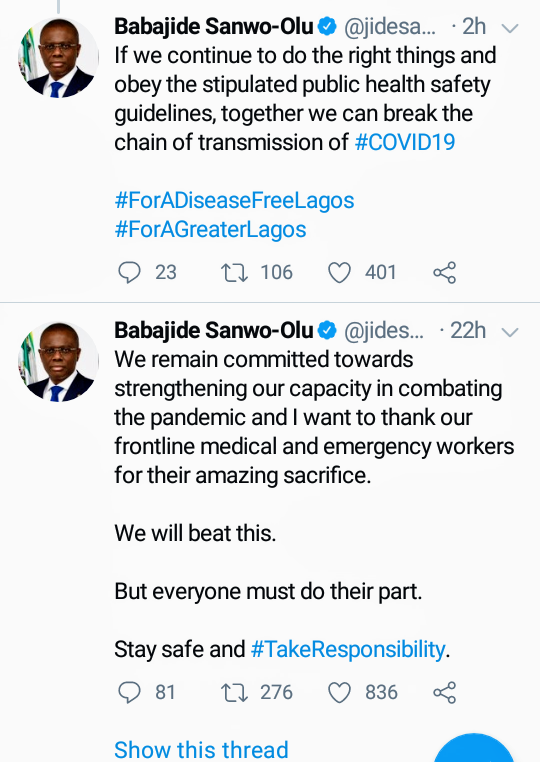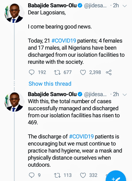 Babajide Sanwo-Olu who announced the discharge of some patients from some of the Lagos isolation centers, just to show the people of Lagos State that the government and health officials are doing their best to make sure this pandemic pass very soon.