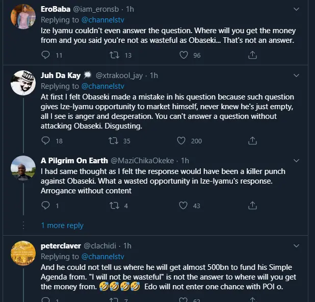 Reactions from the Channels TV twitter page also has most Nigerians slamming the APC candidate for dodging the question put to him by Obaseki.